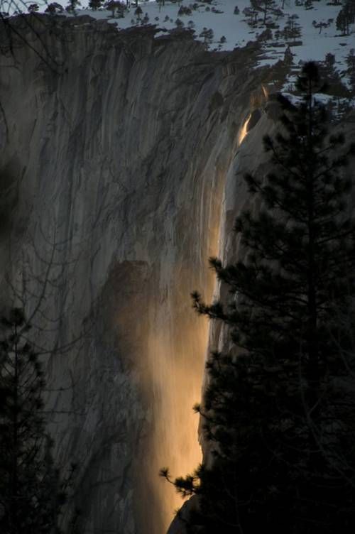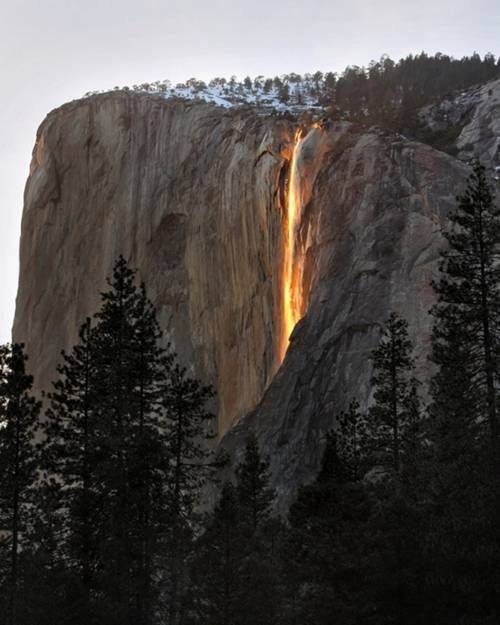 این منظره بدیع تنها در دو هفته آخر ماه فوریه و در یک زمان کوتاه چند روزه ایجاد میشود. به همین دلیل این پارک به "آبشار آتش یوسمیت" Yosemite Firefall نیز معروف است.