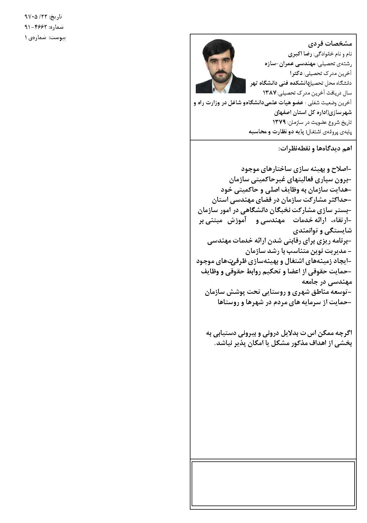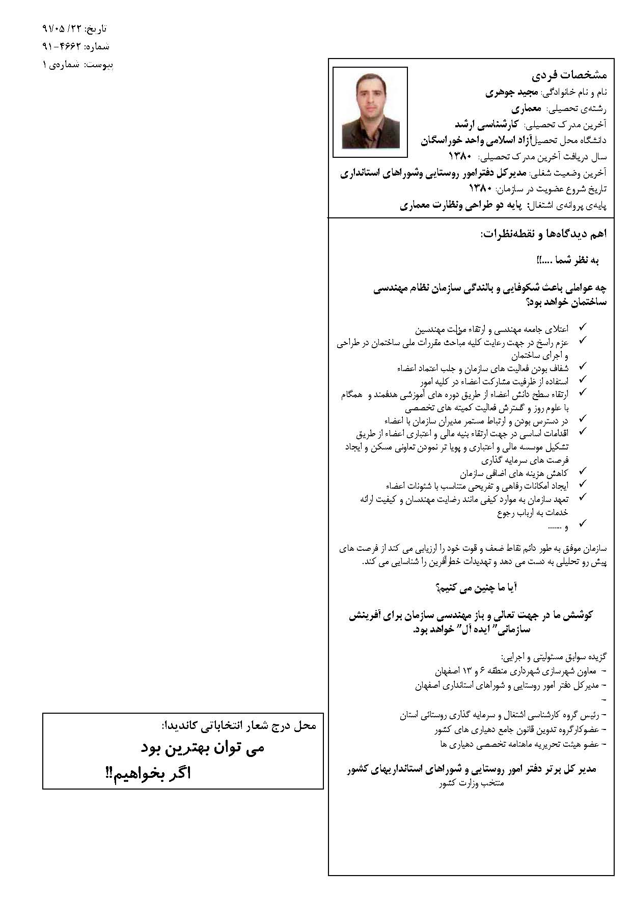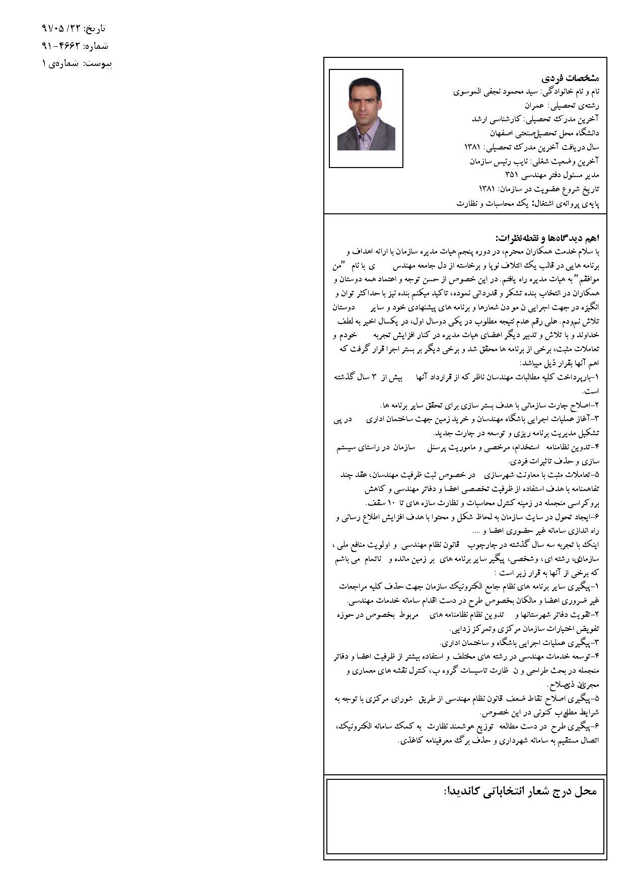 تجربه حضور سه ساله اینجانب در هیئت مدیره سازمان نظام مهندسی اصفهان و برخورد نزدیک با تعداد زیادی از همکاران در داخل و خارج از سازمان و مشاهده عملکردهای آنها، این امکان را برایم فراهم نموده تا بتوانم شناخت و قضاوت نسبتاً درست و واقع بینانه ای در مورد افراد داشته باشم.