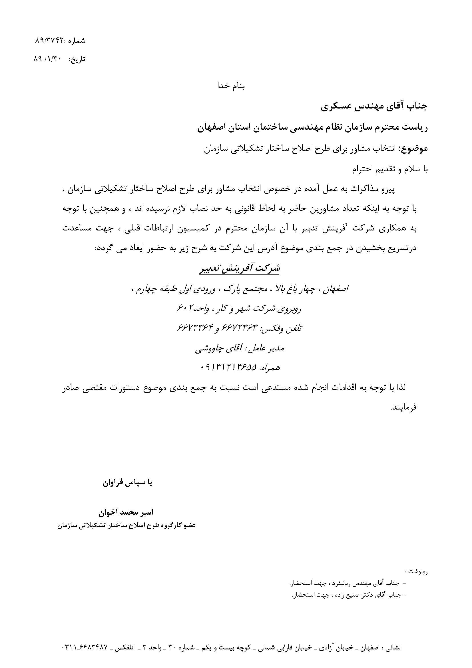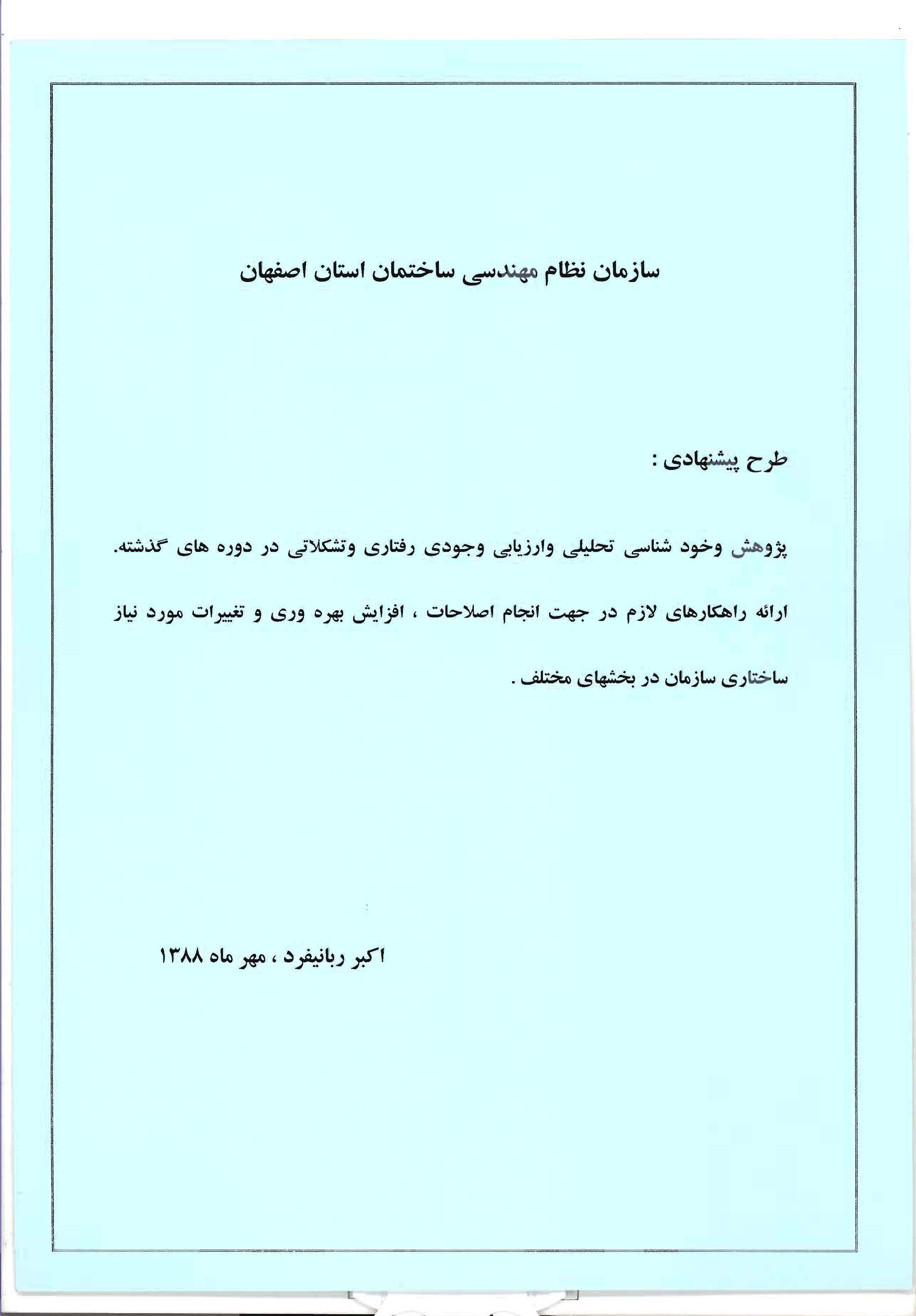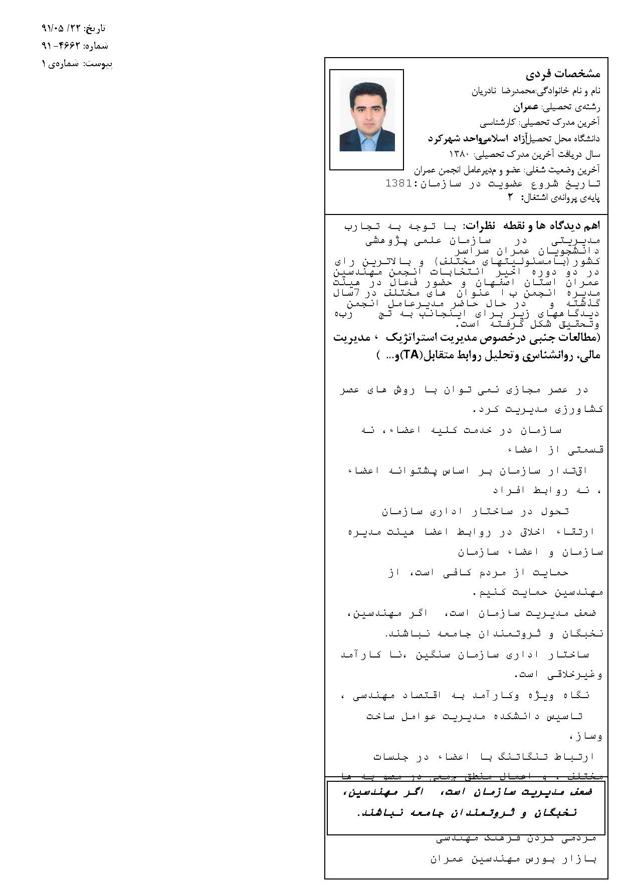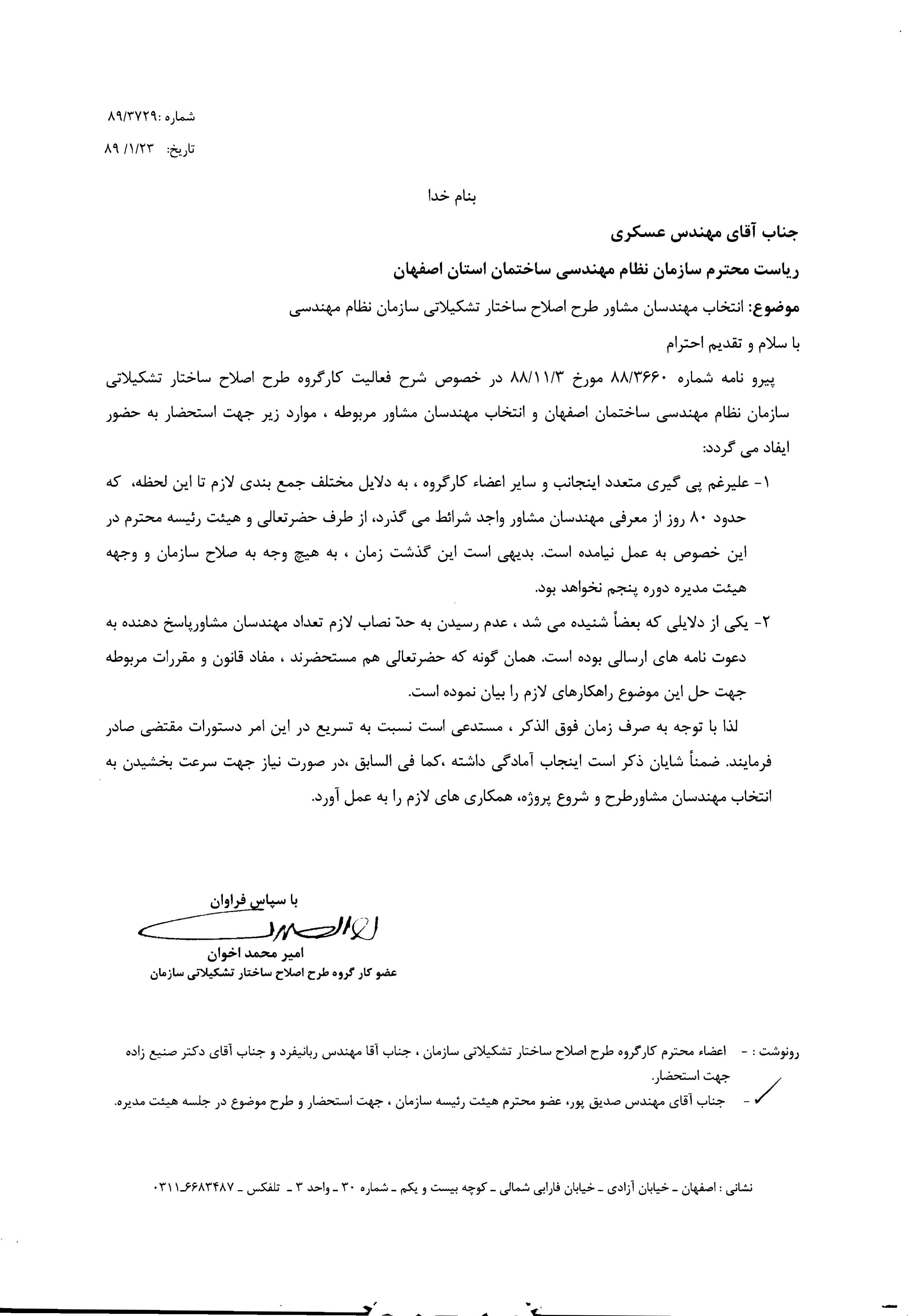 تجربه حضور سه ساله اینجانب در هیئت مدیره سازمان نظام مهندسی اصفهان و برخورد نزدیک با تعداد زیادی از همکاران در داخل و خارج از سازمان و مشاهده عملکردهای آنها، این امکان را برایم فراهم نموده تا بتوانم شناخت و قضاوت نسبتاً درست و واقع بینانه ای در مورد افراد داشته باشم.