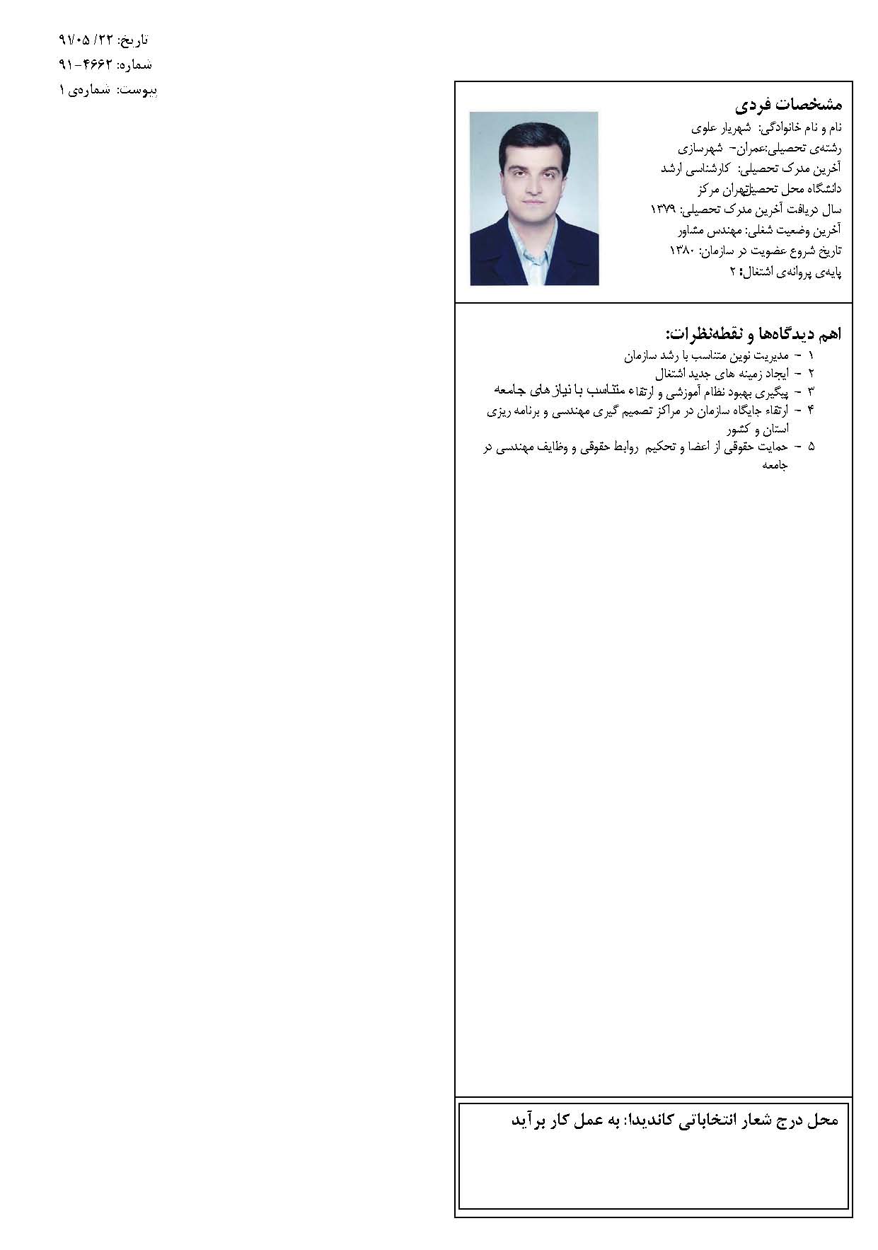 از دوستان خواهش دارم برای تحقق انتظاراتشان از سازمان نظام مهندسی، به تمام افراد لیست رای دهند تا این افراد برای پیاده کردن مصوّبات و طرحها بتوانند رای اکثریت مناسب را حاصل کنند.(مشکل ما در هیئت مدیره دوره پنجم آن بود که بیشتر ایده های ما رای کافی نمی آورد و یا به صورت مثله شده به تصویب می رسید)