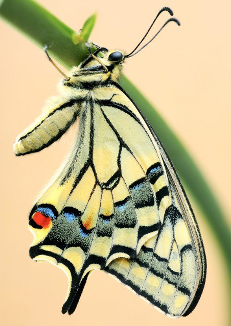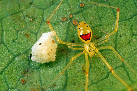 Found only on the islands of Oahu, Molokai, Maui, and Hawaii, the happy face spider, such as this one guarding its eggs on a leaf in Maui, is known for the unique patterns that decorate its pale abdomen. Scientists believe Theridion grallator may have developed its distinctive markings to discourage birds from eating it.